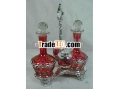 Condiment Set in color glass with beautiful stand.Beautiful condiment set of 4 piece in glass provided with asilver plated brass stand. Too large bottles and 2 small pots. Addlustre to your table.